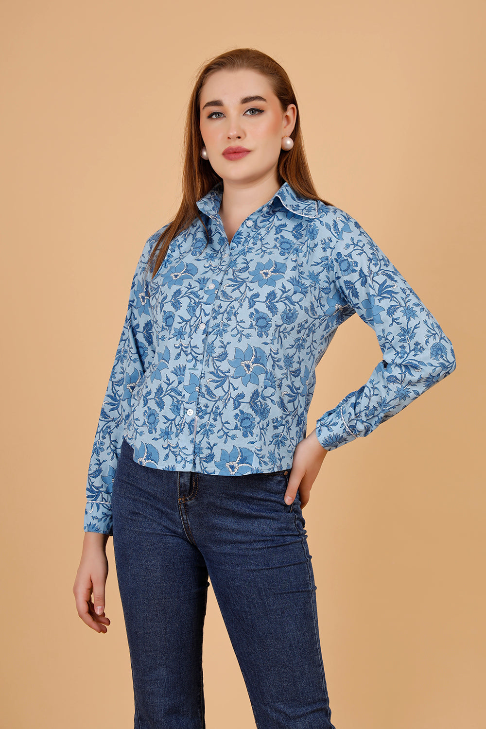 Introducing our Bloom Blue Shirt, an elegant addition to your wardrobe crafted from premium block-printed cotton. This cotton collared shirt features a captivating floral Jaipuri print in a beautiful blue hue. Designed to offer a structured fit, the shirt hits just the right length - not too long and not too short, making it perfect for both work and casual wear.
