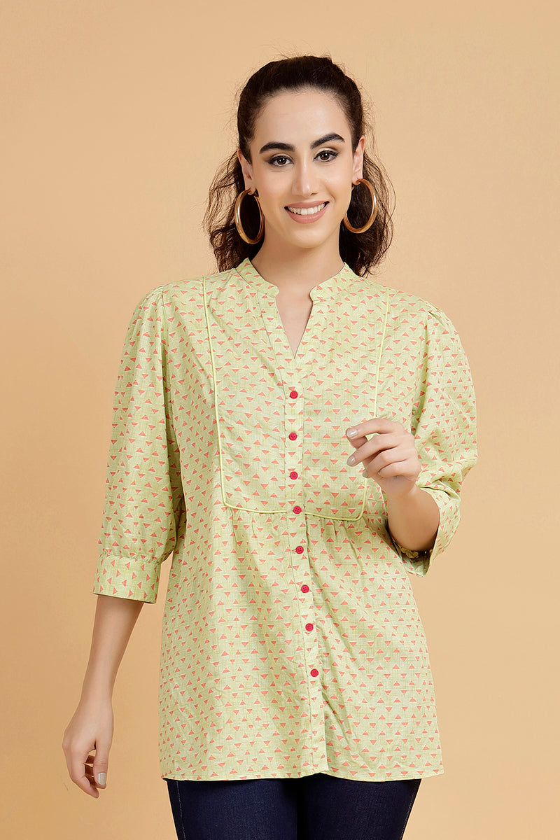 Brighten your wardrobe with the refreshing Cindy Citrus Charm Shirt, a perfect blend of style and comfort for women who love unique and trendy designs. Crafted from breathable and lightweight viscose fabric, this lime-green shirt features a playful contrast citrus print that adds a fresh, summery vibe. The bright red buttons provide a bold accent, making it a standout piece in your collection of trendy women's shirts.