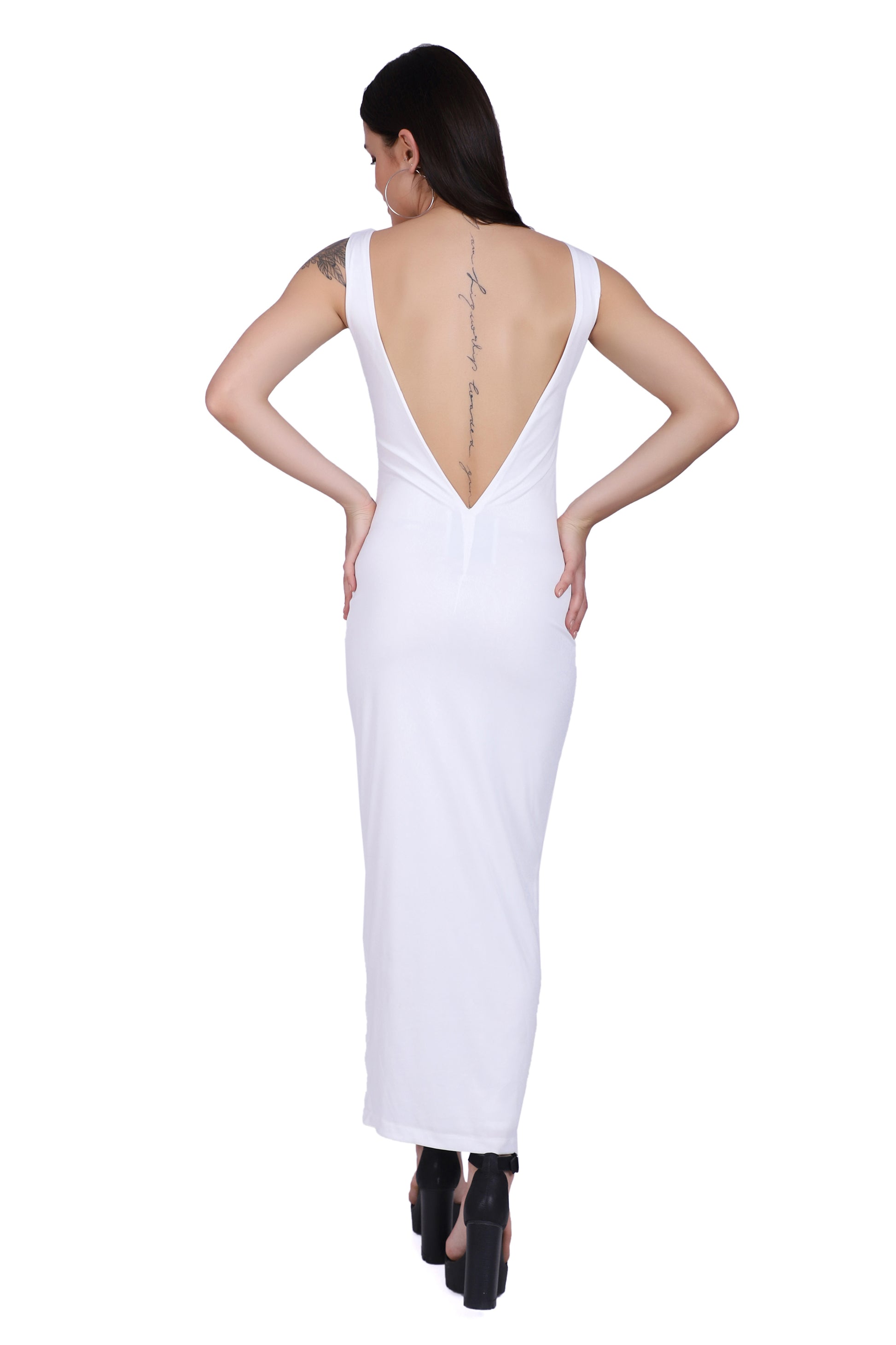 Full length bodycon dress with deep plunge back. An essential dress in sparkling white, always in fashion and never out of style.